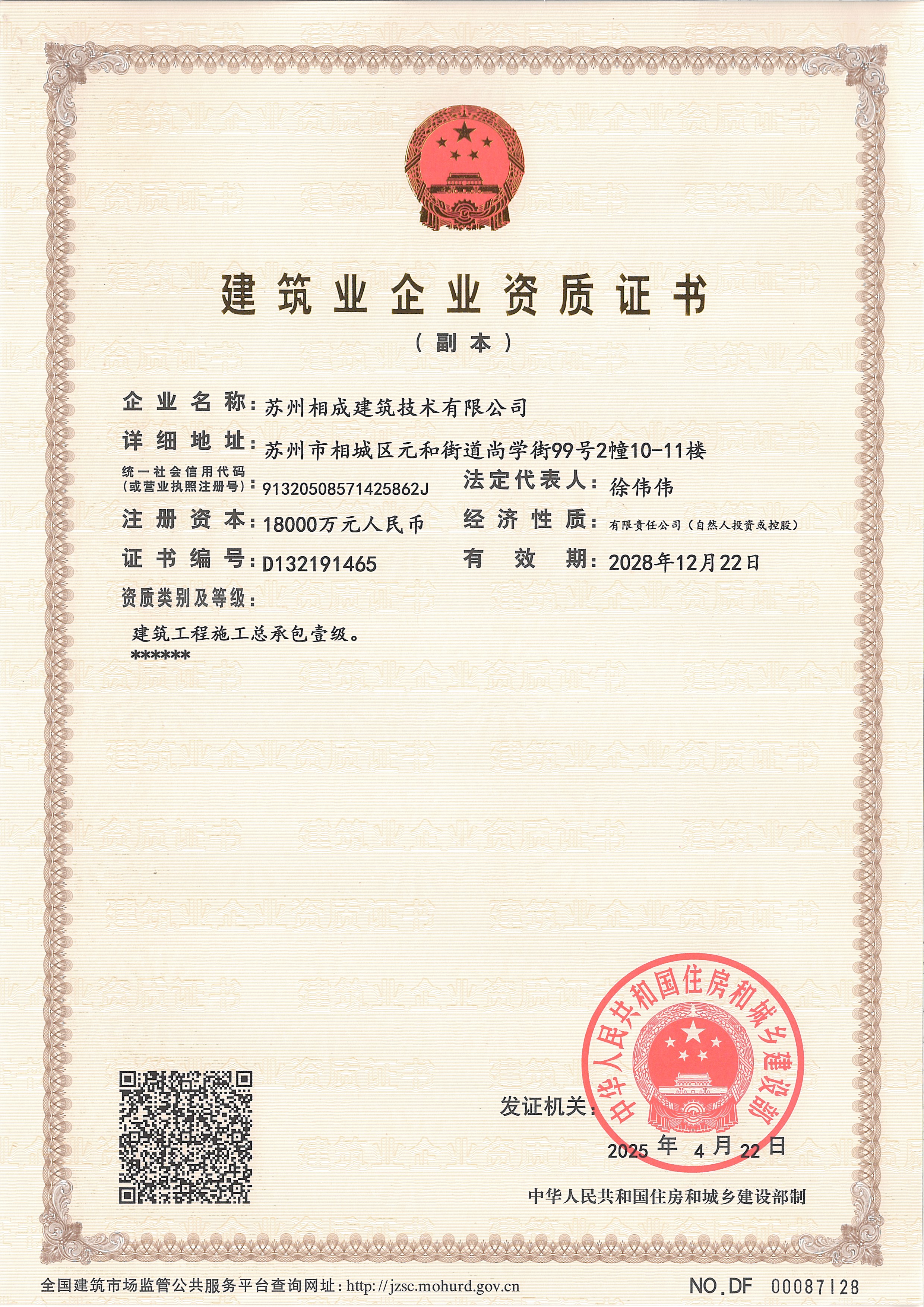 作為蘇州市建筑行業協會、蘇州市建設監理行業協會、蘇州市房屋安全協會、江蘇省企業信用管理協會、江蘇省建設監理與招投標協會等會員單位。相成建筑擁有自己高水平的管理團隊、專家團隊、施工團隊,本科以上學歷專業技術人數達40%,中級以上專業技術職稱人數達60%。在多年的工程施工中造就了過硬的施工技術,獲得省、市建筑施工標準化文明示范工地,受到業主的廣泛好評,贏得了良好的社會信譽和經濟效益。